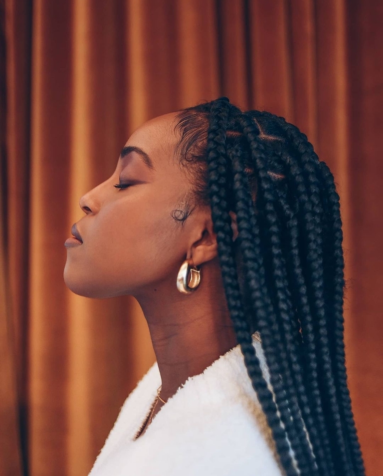 Jet black hair pulled back in a perfect french plaited ponytail, edges carefully brushed to create wave patterns matching the curls of her glorious afro hair. Her face featuring intriguing features and an ambience exuding femininity. She is perfectly poised within a mosaic swathe to reflect just enough detail to hold your gaze a tad bit longer than you would have perhaps hoped for.